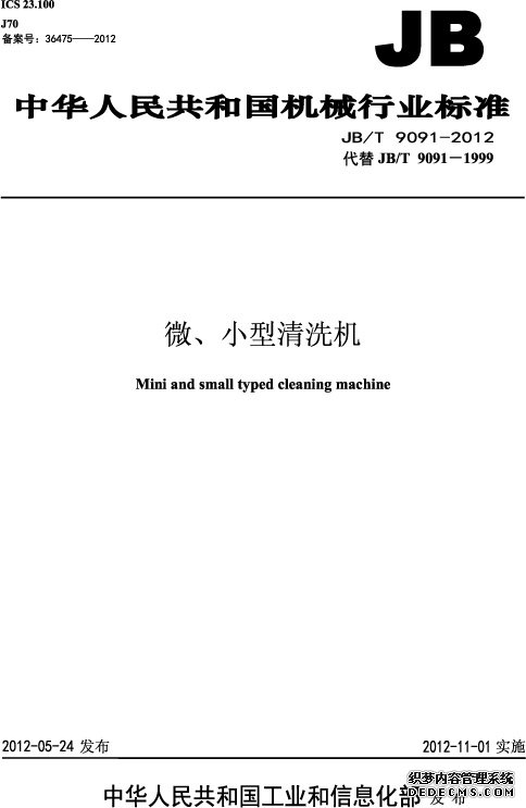 熊貓通用機(jī)械集團(tuán)有限公司和合肥通用機(jī)械研究所(即中國(guó)通用機(jī)械研究院)起草了《微、小型清洗機(jī)》的行業(yè)標(biāo)準(zhǔn),并在2012年11月1日正式開始實(shí)施。該 標(biāo)準(zhǔn)涉及了最大壓力40MPa,最大90L/min的大部分常見的高壓清洗機(jī),也可以說就是高壓清洗機(jī)的行業(yè)標(biāo)準(zhǔn)。